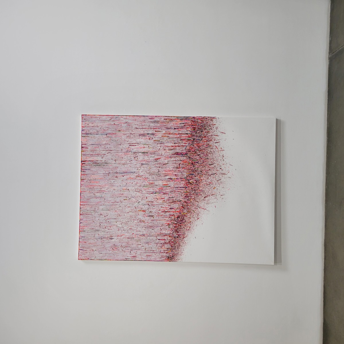Each canvas is built up with some 50 layers of acrylic paint, only to be meticulously carved, sliced, and reassembled. Using scalpels and blades, she excavates hidden textures and colors, revealing a visual terrain that is at once chaotic and serene. This