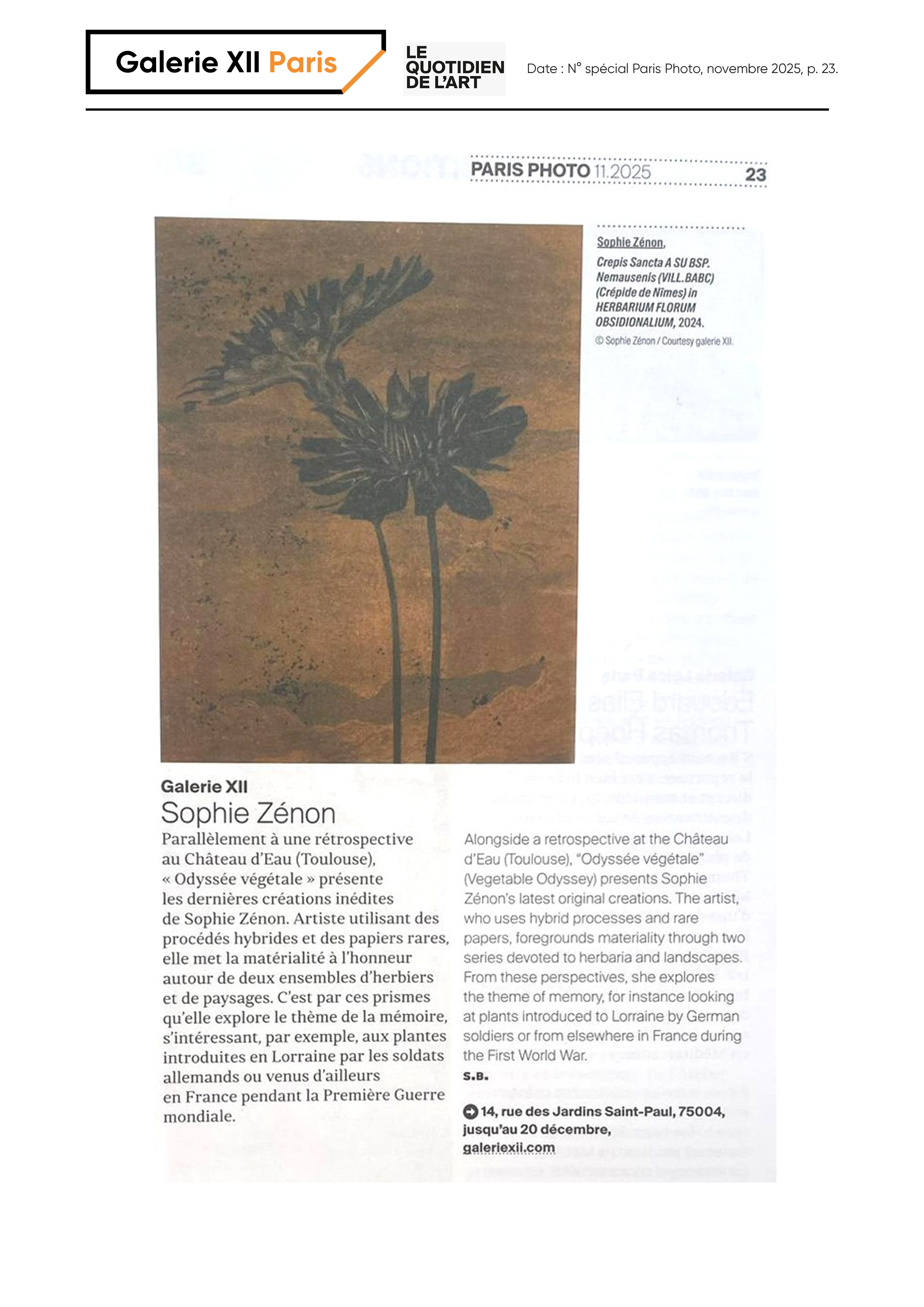 Galerie XII Paris is pleased to present, from November 7 to December 20, 2025, BOTANICAL ODYSSEY, a solo exhibition by Sophie Zénon. Running in parallel with her retrospective L’HUMUS DU MONDE at the Château d’Eau in Toulouse, the artist unveils at the gallery a series of new works — the fruit of her latest research into the relationships between plants and humans, explored through the prism of migration. True to her focus on materials and craftsmanship, she presents two groups of works — herbaria and landscapes — delicate and precious creations enhanced by the artist’s gesture, where the vegetal becomes a bearer of historical and political meaning. Combining natural and anthropic processes, her approach questions the notions of endemic and non-native species, climate change, and movement across territorial and political borders.