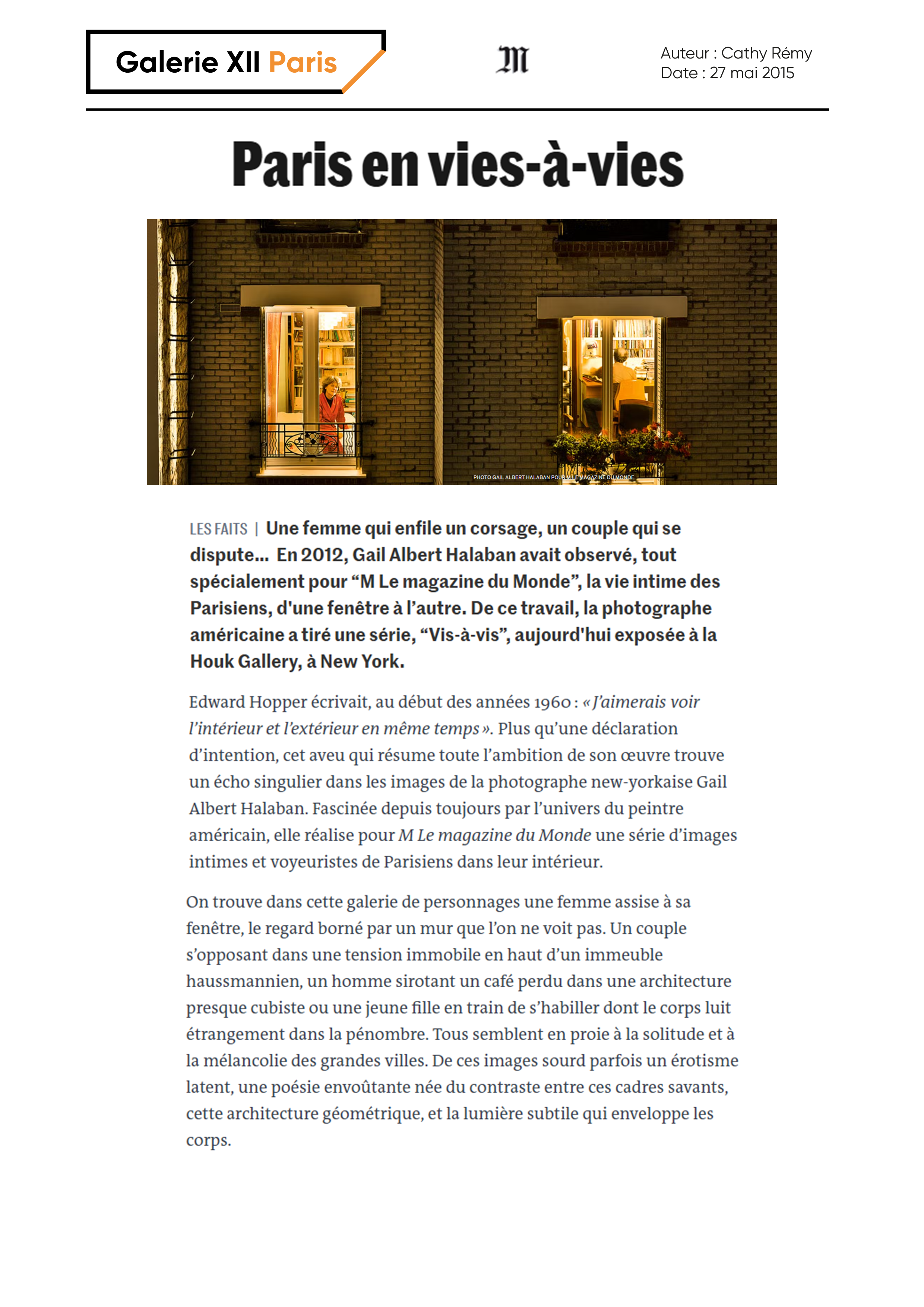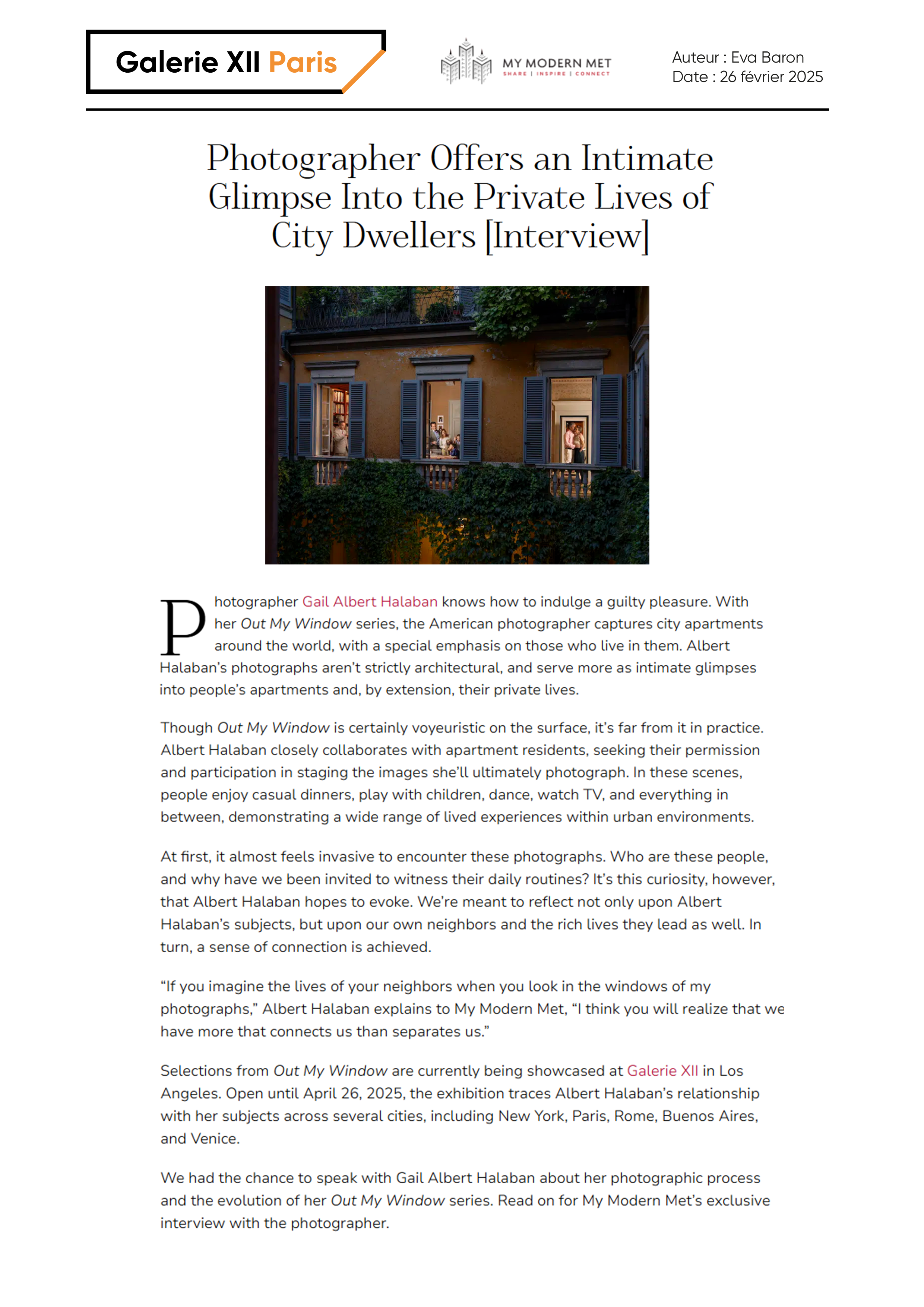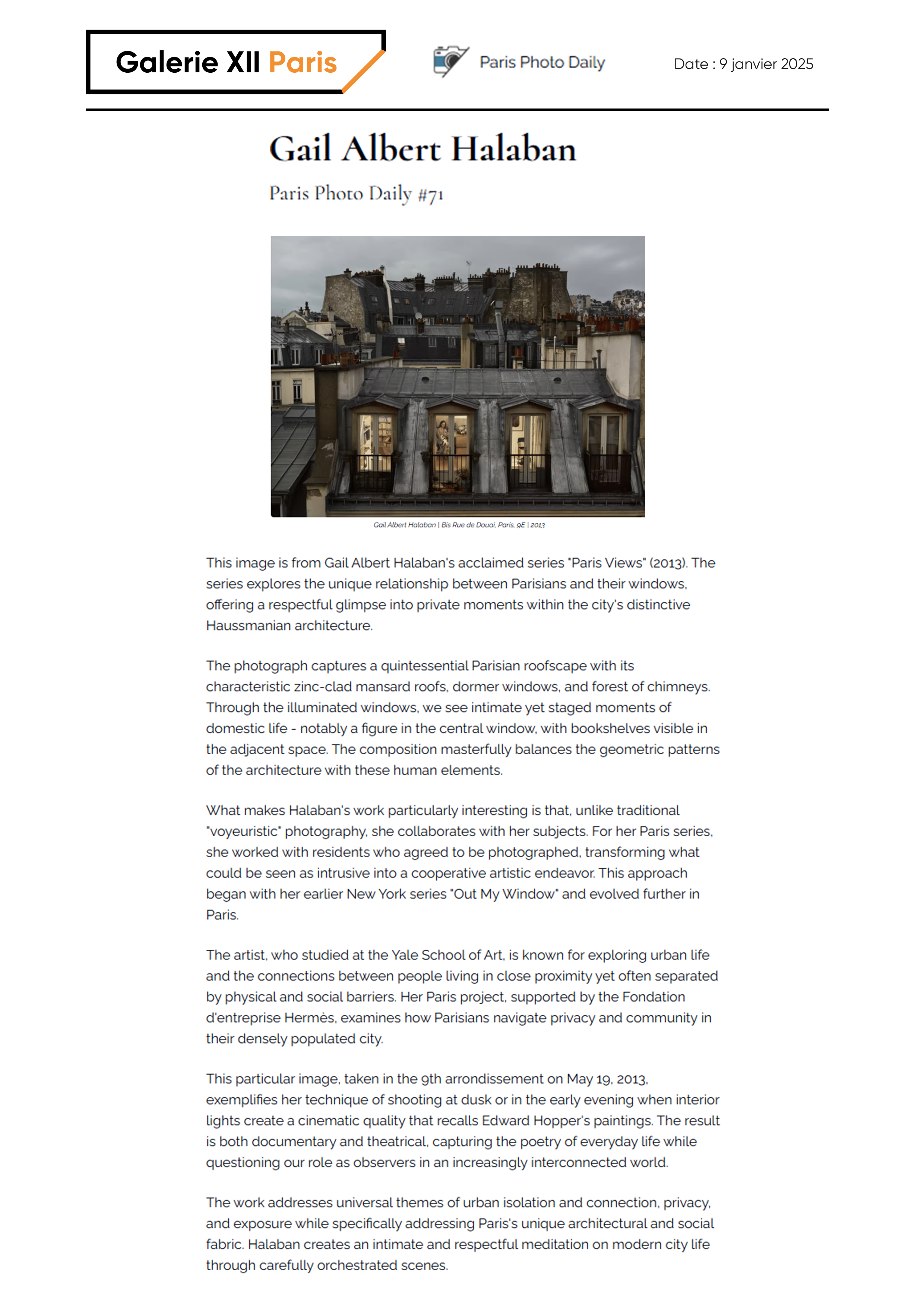 Gail Albert Halaban a étudié à la Rhode Island School of Design, puis a obtenu un BA et un MFA de l'Université Brown et de l'Université Yale. Sous la tutelle de Nan Goldin et Gregory Crewdson à Yale, Gail Halaban a affiné sa pratique et sa vision, se situant à l'intersection entre l'approche documentaire réaliste de Goldin et la maîtrise des récits mis en scène de Crewdson. Pour sa série "Out My Window", un projet en cours depuis 2007, Gail Halaban collabore avec les habitants d’immeubles dans différentes capitales (New York, Paris, Istamboul, Venise, Buenos Aires,…) pour créer avec eux un aperçu voyeuriste de leurs vies partagées et simultanées, chaque sujet représentant des fragments uniques d'une identité collective : voisins, citadins et êtres humains vivant une expérience indéniablement liée.